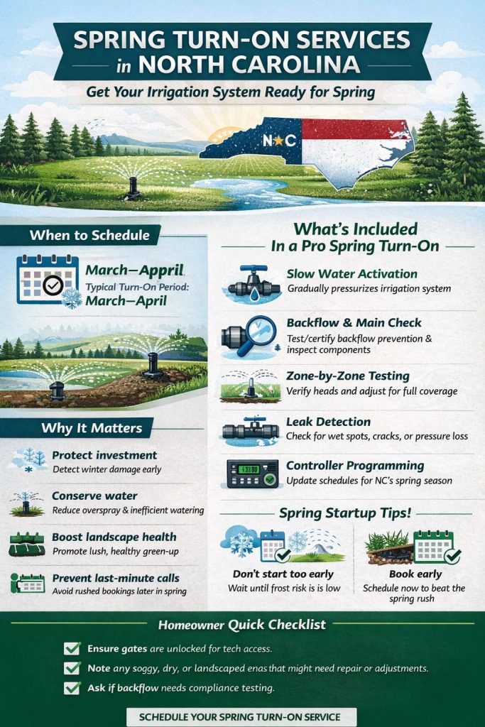 North Carolina’s spring weather is unpredictable: warm stretches can arrive early, but late cold snaps still happen. That variability can expose weaknesses in irrigation systems—especially if there was any leftover water in lines or fittings. A professional startup helps catch issues before they become expensive mid-season breakdowns.